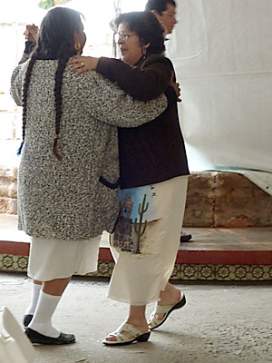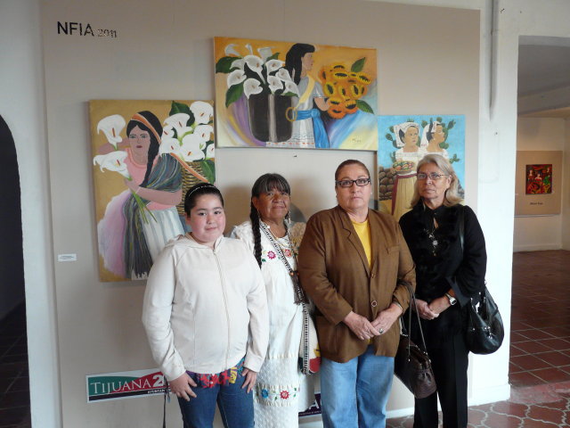 Mujeres cochimí enfrente de las pinturas de Juana Villa Poblano (segunda del izq.)